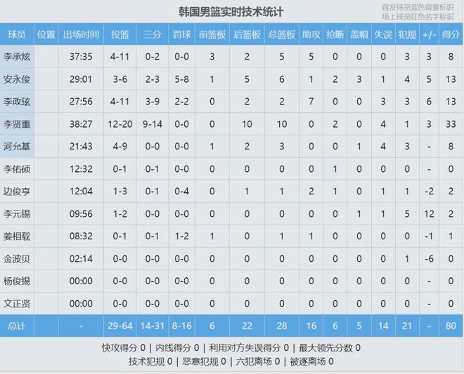 全场结束,中国男篮76比80不敌韩国。张镇麟20分、廖三宁17分;李贤重三分14中9,狂砍33分10板。最后看看数据,说说你的心情: