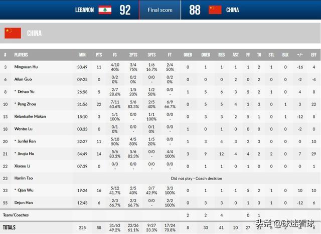 而在世预赛方面,上一届中国男篮世界杯第四窗口期预选赛,中国男篮由杜锋指导率领的蓝队曾以88-92不敌对方,以下是当时具体的技术统计。